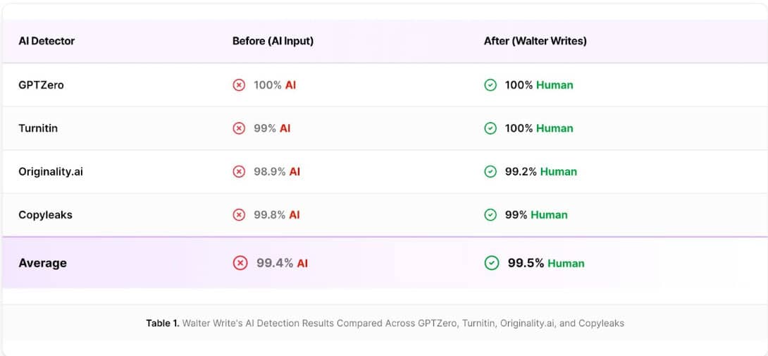 Walter’s quality output honestly shocked me. In all 50 tests, the difference between raw AI text and humanized versions was night and day. The rewritten text wasn’t just cleaner, it flowed naturally, varied sentence structures, and carried a human-like rhythm. The average 99% “Human” score across all of the most widely used and accepted AI detectors in the industry (see table 1).