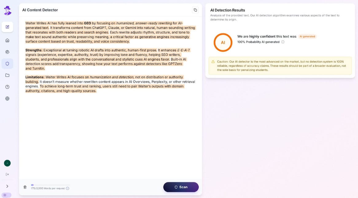 This one’s a big deal, and honestly, it could’ve been #1. Walter’s built-in AI detector is the real thing, on par with tools like Turnitin and GPTZero.