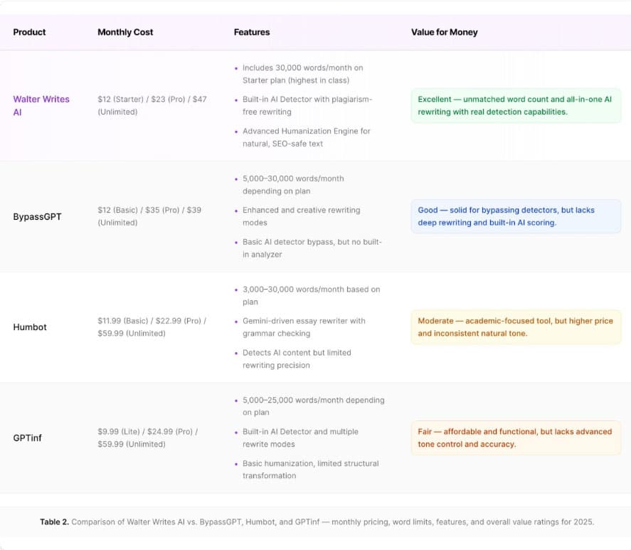 Unlike most humanizer tools that rely on randomness to fool detectors, Walter Writes AI creates coherent, readable text that actually sounds human. When compared to tools like BypassGPT, Humbot and GPTinf, Walter’s rewritten outputs consistently performed better in both readability and AI detection tests.